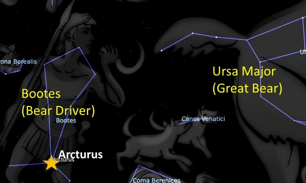 that can be seen by watchful eyes. Twinkling brightly “up above the world so high, like a diamond in the sky.” Except, they aren’t all diamonds. In fact, at this time of year, the first star I see shines with a reddish-orange glow that is more like a dazzling ruby, and its name is Arcturus: “Guardian of the Bear!”