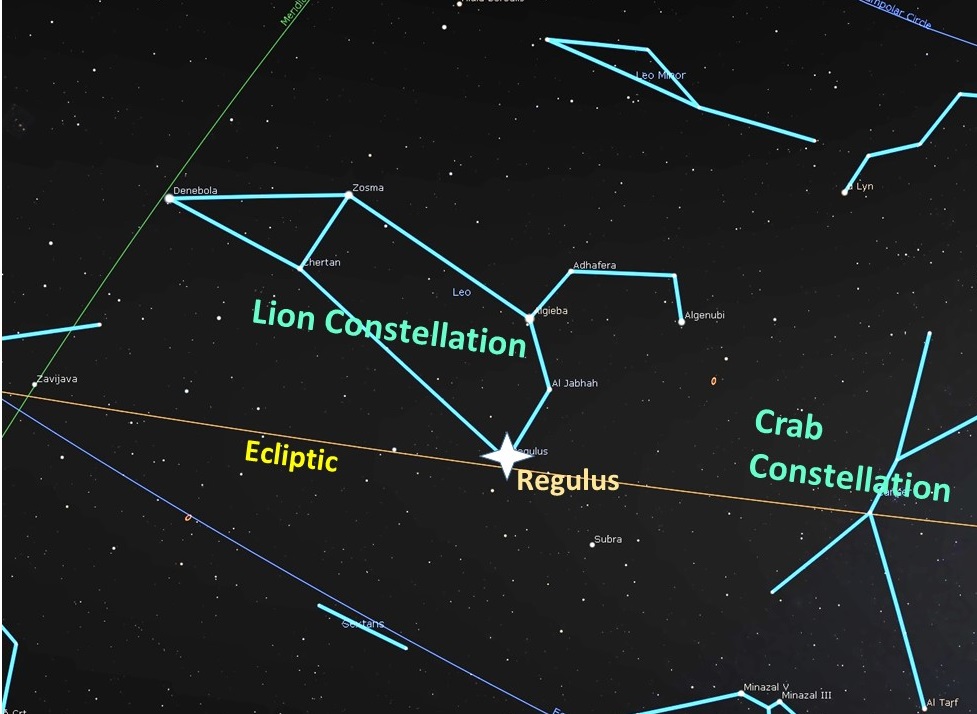 Another important factor for astrologers to consider is the usefulness of the Lion’s brightest star, Regulus, in locating and visualizing the path of the sun and all the “wanderers.” Regulus is actually the closest bright star to the ecliptic, sitting just 28 minutes north of the ecliptic. Also, at 0 Virgo 06, it gives us a great marker for the boundary between the signs of Leo and Virgo on the sky’s dome.