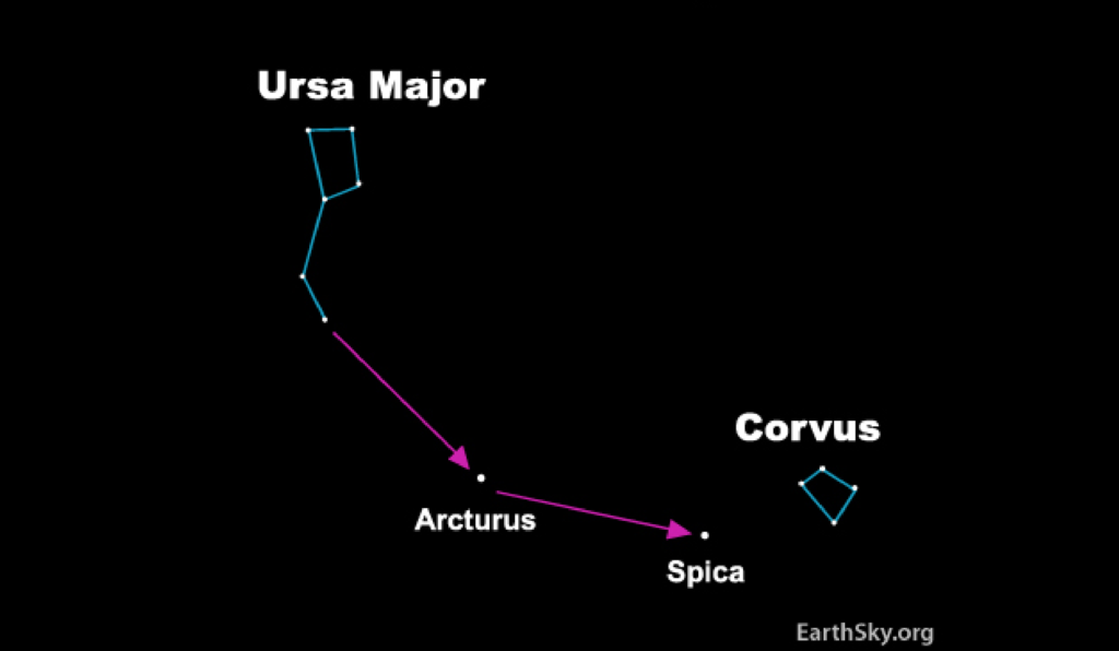 If you are still unsure of how to locate Arcturus, just remember the old mneumonic: “follow the arc to Arcturus!” That is, follow the handle of the Big Dipper as it curves away from the bucket in an arc that, if extended, continues on to point right to our new reddish friend.